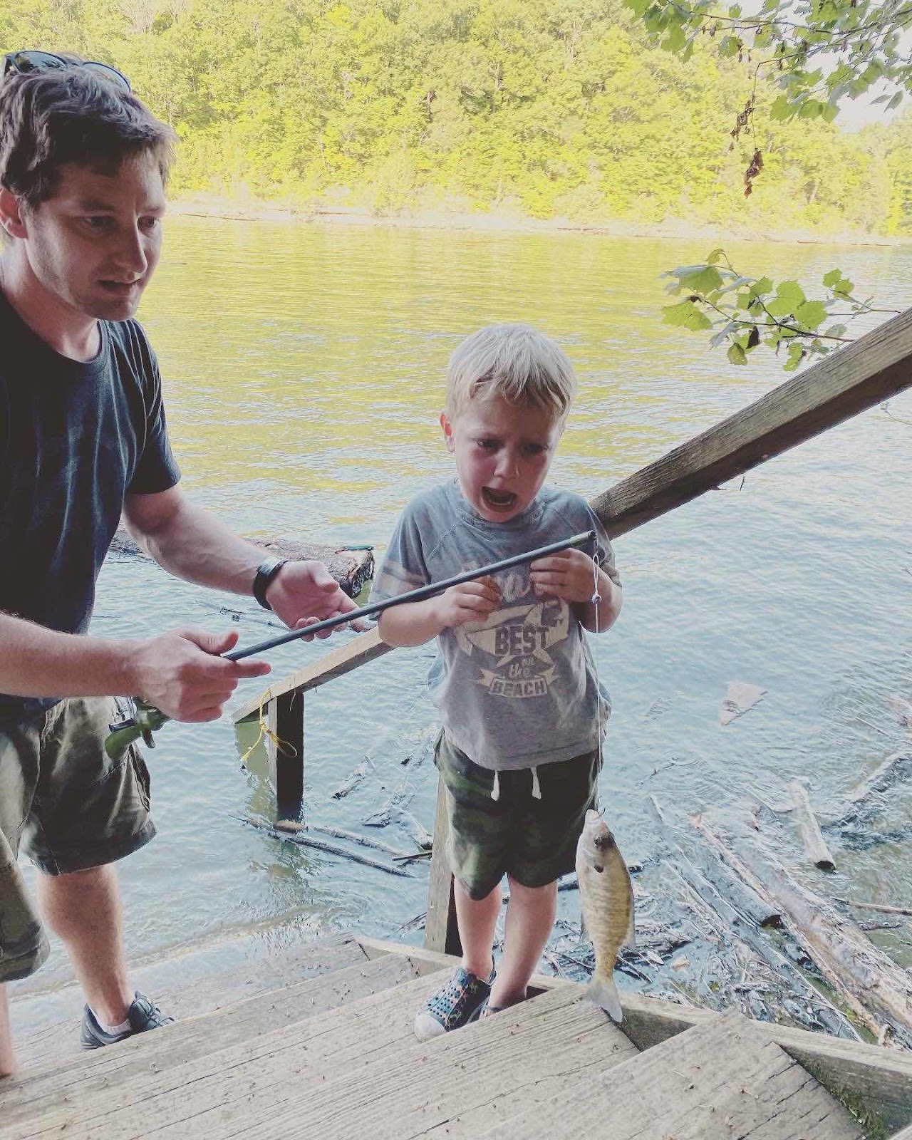 He was so proud of catching a fish, was so excited reeling it in, and when he saw it up close he was terrified and refused to cast out again.